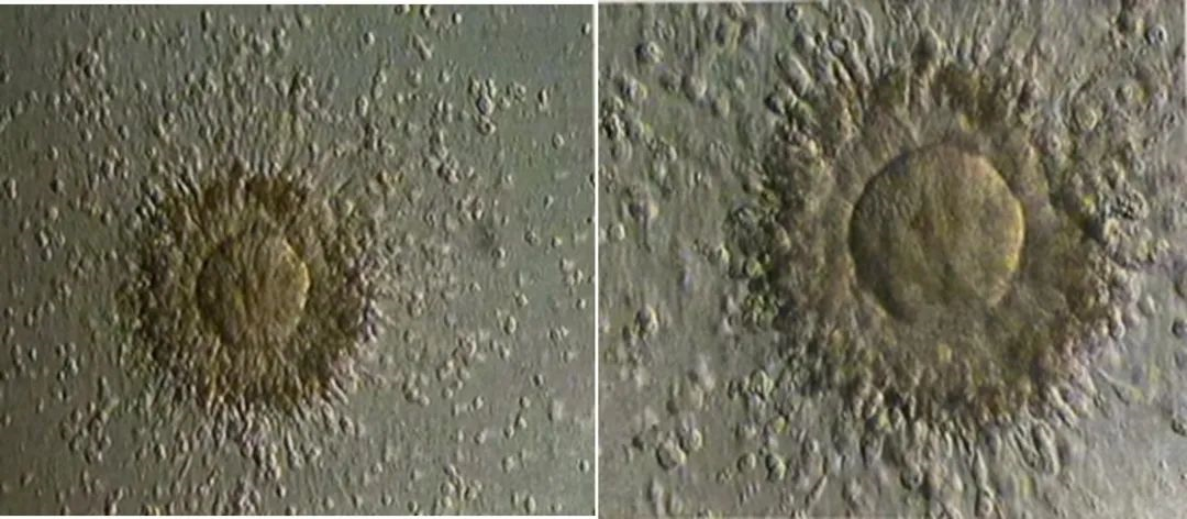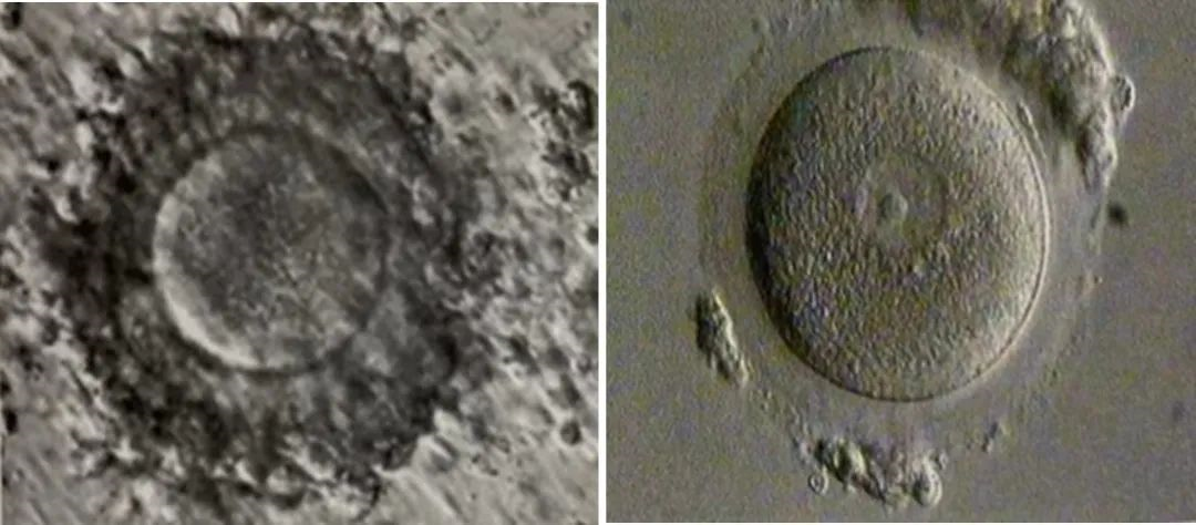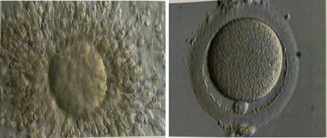 卵泡膜颗粒细胞细小呈致密块状;无卵丘细胞粘液块,未扩散的周围细胞致密地附着于卵母细胞的透明带上;显微镜下观察到卵子中央的胞质色深呈颗粒状,卵母细胞中央有一个球形的核,核中包含单个折光的核仁。
