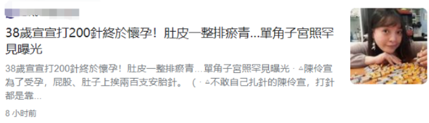 或许是感觉到没有孩子婚姻的不快乐,宣宣还是义无反顾地走上了试管婴儿的道路,由于自身情况特殊,每天都要打针,前后经历了200余针,受尽了生理上的痛苦和心理上的折磨。曾经某次丈夫不在,宣宣只能自己动手,可以说宣宣为了要个孩子是拼尽了全力。