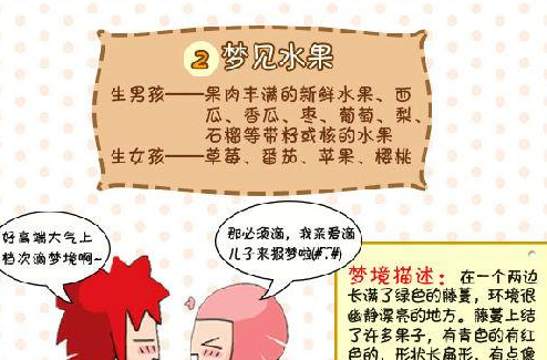 吃香瓜或得到香瓜会生儿子;如果梦见果肉丰满的新鲜水果,生儿子的几率很高。如果水果的数量为奇数,更说明是儿子。