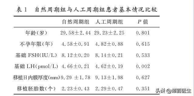 1自然周期组和人工周期组患者基本情况比较见表1。两组患者的年龄、不孕年限、周期第3天基础E2值、移植日内膜厚度、移植胚胎数和移植胚胎级别,差异无统计学意义(P>0.05);两组基础促卵泡素(FSH)水平、基础黄体生成素(LH)水平,差异有统计学意义(P<0.05)。