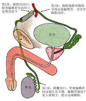 第1步:取阴囊切口,探查睾丸有精子,向输精管远端注水提示不通畅,输精管液涂片见大量精子。