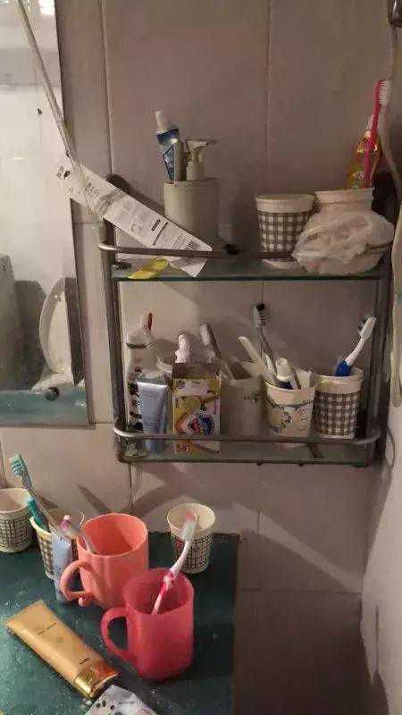 卧室内如此多床铺,其他设备自然是摆放不下了,连带着的,入住者的东西也只能凌乱地摆放在四处,公用的卫生间里,连放置牙膏牙刷的杯子,都足足摆了十几个……