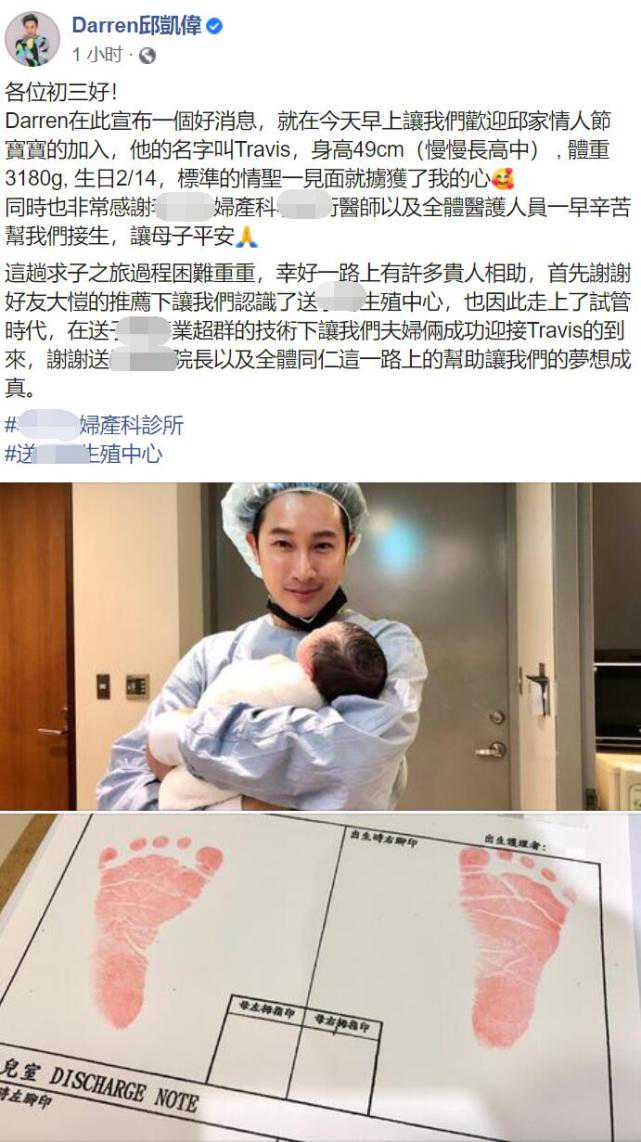 情人节喜讯不仅此而已。据台媒2月14道,在《小娘惹》中饰演陈盛一角的45岁台湾知名男星邱凯伟分享了儿子于情人节当天出生的好消息。
