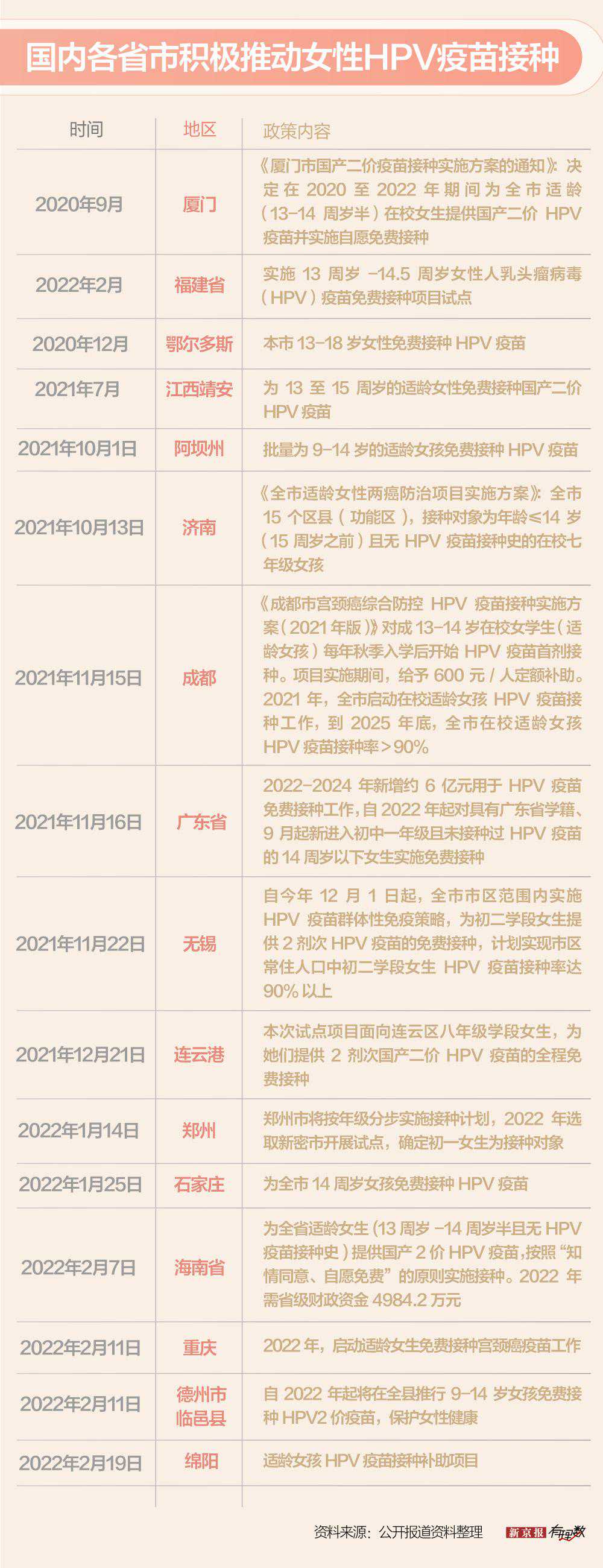 对此,我国政府鼓励符合条件的省份将HPV疫苗纳入公共接种范围,厦门、鄂尔多斯、济南和广东等多个城市和省份先行试点,开始为部分15周岁以下的女生免费接种HPV疫苗。