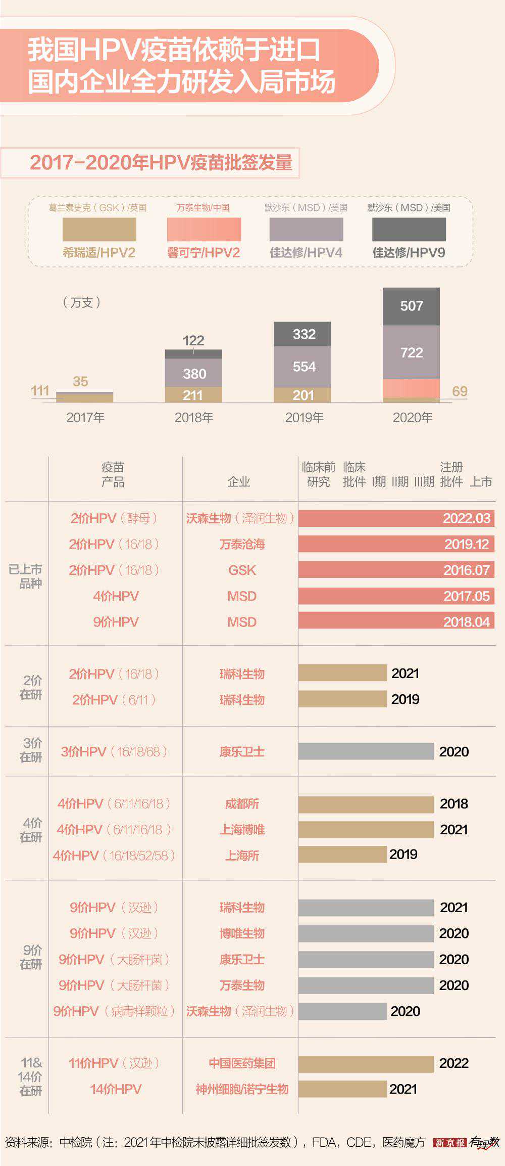 国内HPV疫苗研发起步晚,但发展速度快。2022年3月云南沃森生物的沃泽惠二价疫苗批准上市,一定程度上缓解了我国疫苗难约的局面。
