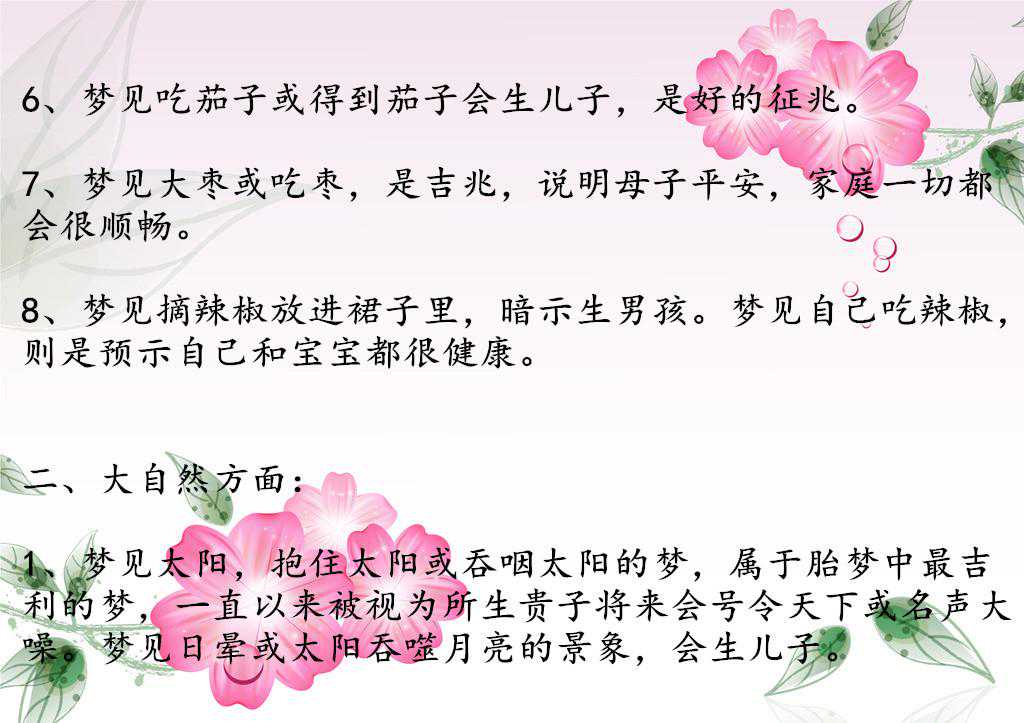 胎梦是一个遥远的传说。其实不管生男生女,只要宝宝健康,聪明,活泼就是每个家庭的最大的幸福。祝每位准妈妈都生一个健康的宝宝。