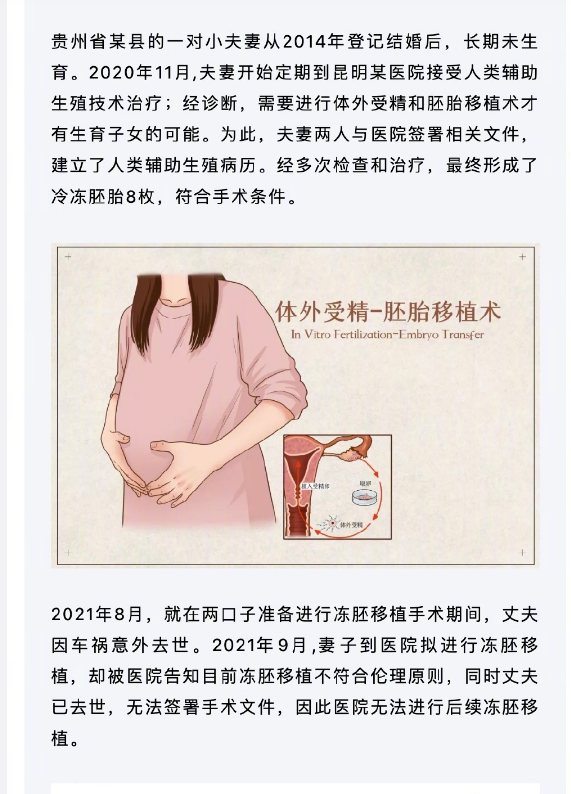 近日,云南昆明呈贡区人民法院通报一起丈夫意外去世,妻子欲完成胚胎移植生子遭拒的案件。一对夫妻2014年结婚后长期未生育,2020年到昆明某医院接受人类辅助生殖治疗。2021年8月,就在两口子准备进行冻......