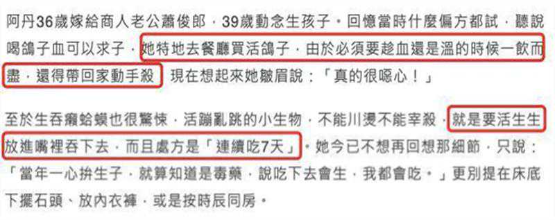 听说喝温热的鸽子血可以让人怀孕,周丹薇就特地到餐厅购买鸽子,然后回去自己动手杀完取血,再一饮而尽;还有“连续七天生吞懒蛤蟆”,处方还表示不能烫也不能宰杀,就是要活生生地吞下去。
