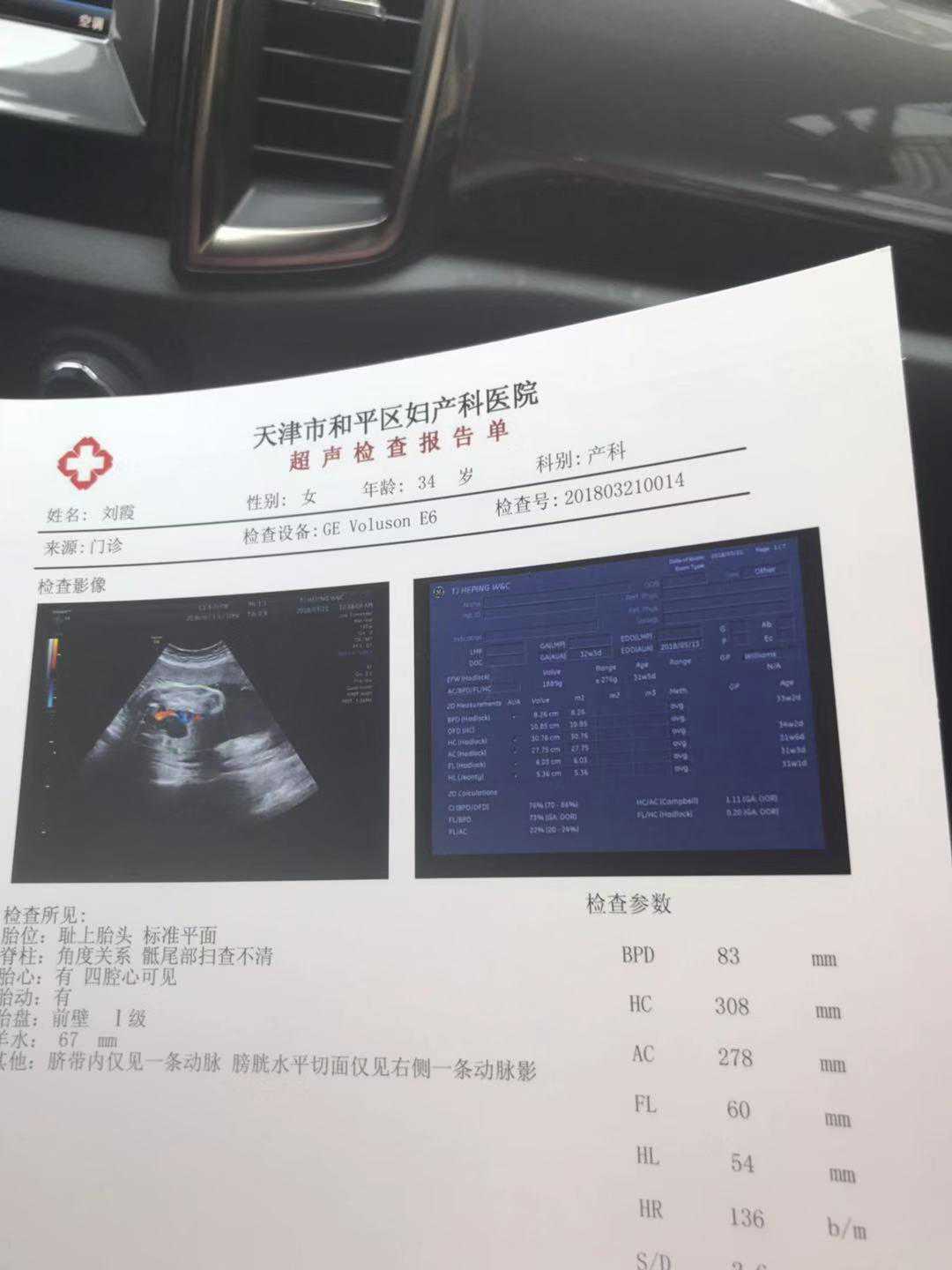 怀孕后我就休假安心养胎,NT、无创、每月一次B超从没有落下过,我年龄大,又有吸烟史,年轻时还好喝点小酒,所以生怕会影响到宝宝发育,还好,都过关了!