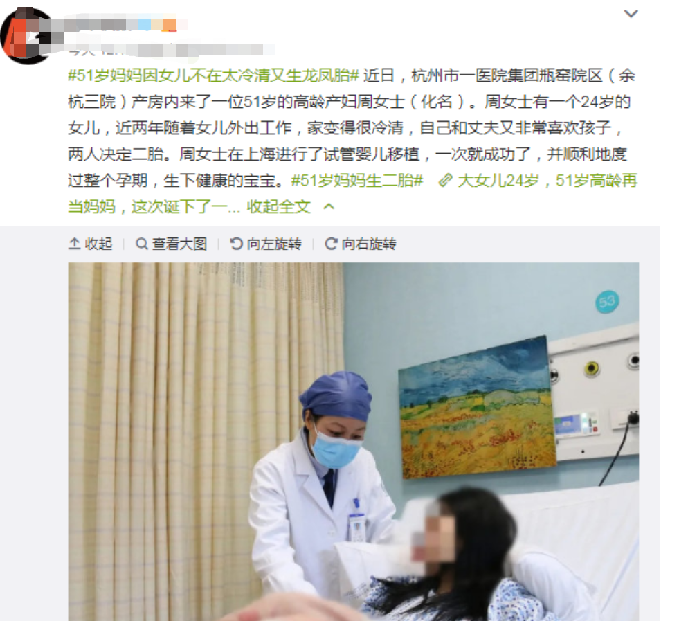 3月17日,在余杭一医院51岁的周女士生下了龙凤胎,夫妻俩非常的高兴。周女士也是余杭三院建院70年来年龄最大的产妇。年纪这么大,为什么还会生孩子呢?周女士说,自己年轻时生下女儿,响应国家的号召,就只有......