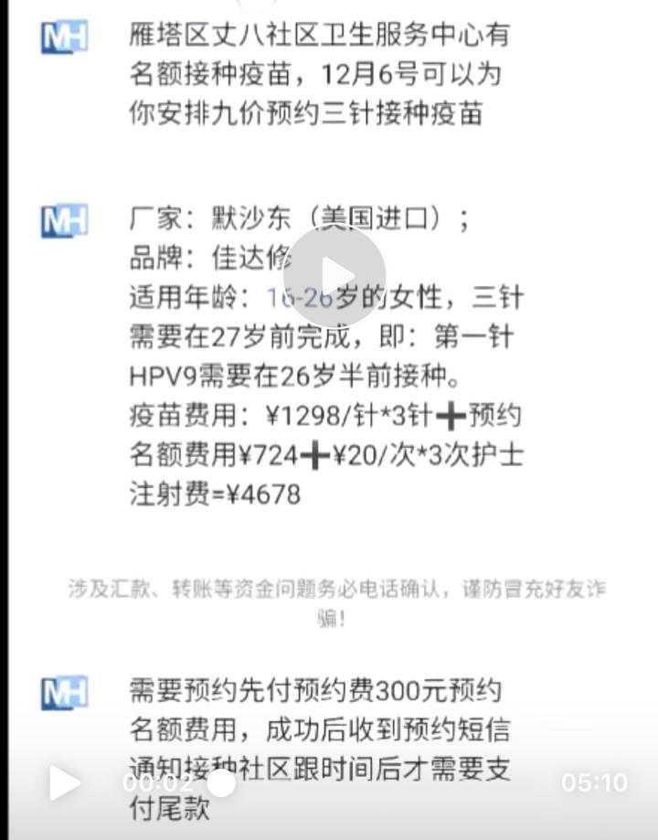 “我从去年就开始预约九价HPV疫苗,但一直没有预约上,我都25岁了,真的等不起”。今年12月,西安女孩陆茜在刷微博时,偶然看到了一条“代约九价疫苗的消息”,点开该用户的头像,陆茜发了消息过去,很快得到了回应。对方称西安雁塔区丈八社区卫生服务中心有名额可以接种疫苗,并表示两天后就可以安排接种,疫苗的价格是1298元一针,一共需要注射3针,同时还要付名额费用724元以及20元一次,一共三次的护士注射费,总计4678元。预约的话需要先支付300元预约名额费用,收到预约成功的短信后再支付剩余的尾款。